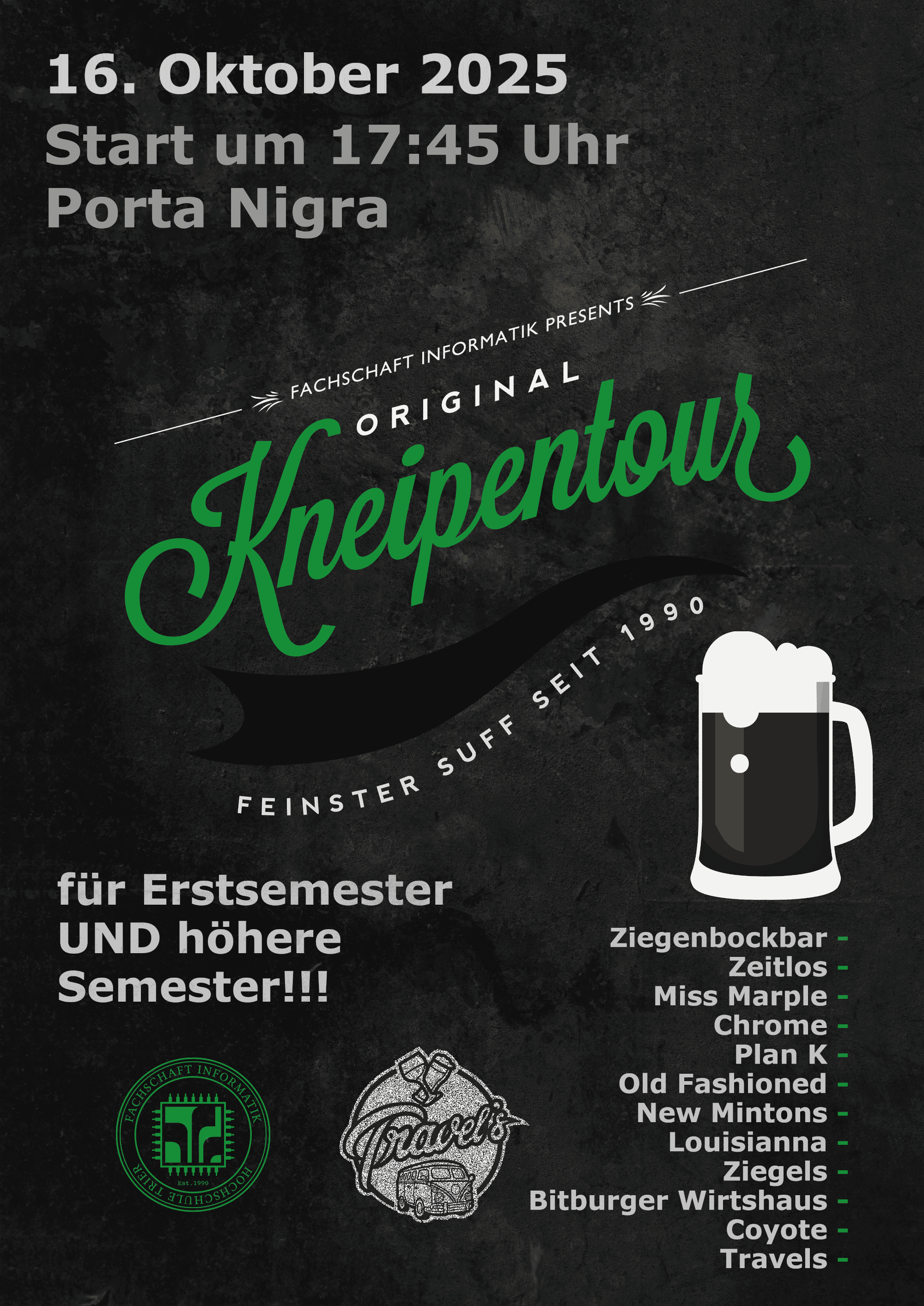 Bei der legendären Kneipentour der Fachschaft Informatik tun sich Erstis mit höheren Semestern in Gruppen mit einer Stärke von ~20 Personen zusammen und besuchen nacheinander vier Kneipen im Trierer Nachtleben. Beginn ist 17:45 Uhr an der Porta Nigra. Gegen 23:00 Uhr Treffen sich alle Gruppen zur Abschlussfete im Travels, einer modernen Kellerkneipe mit Pool-Billard-Tisch!